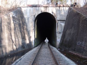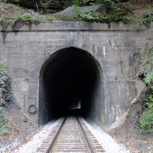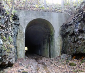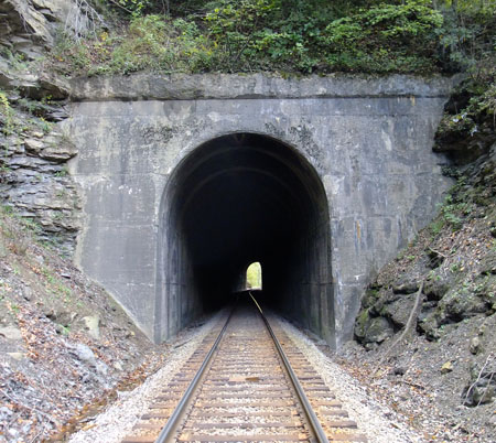 This is Pettit tunnel, just south of Clinchco and Squirrel Camp tunnel (so named, it’s said, because squirrel was about all the tunneling crew had to eat while they worked there). It sports a 1928 dating. Nice, sensible tunnel, 379′ long at 37.133940, -82.369548, just off Highway 63 (revisited). This was one of those “Well, here it is. Take a picture. Okay, what’s next?”. Next is Caney Fork tunnel, that’s what. Squirrel’s actually pretty good, btw. Mom used to make a killer fried squirrel with gravy.