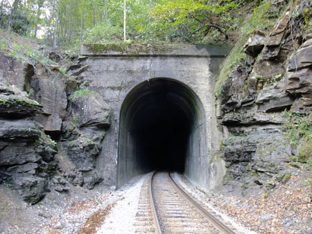 Well, here we are at Buffalo tunnel, 26 miles south of Elkhorn City. The tunnel bores 352′ through a ridge where the railroad, which has been heading in generally easterly direction for a few miles, kinks sharply (for a railroad) to the south. We’re by the McClure river, a bit north of Nora, in Dickenson County. Decimal coordinates: 37.080040, -82.351309.