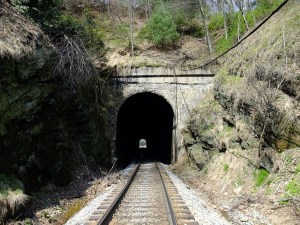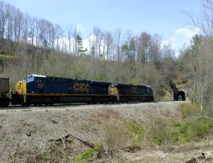 As the CSX heads down the Blue Ridge, it makes the first Loop, curling around to come back to about 100′ away from the tangent that leads into it (but 132′ lower). Coming out of 2nd Washburn, about 1/4 mile away to the south, lies Quinn Knob tunnel, 545′ long. It carries a 1912 date on this south lintel at 35.841637, -82.041630. It’s on a slight bend, leading to 3rd Washburn, which we’ll get to shortly. Then we’ll take a break and gaze at four tunnels down on Norris Lake. Ever hear of the Knoxville, Cumberland Gap & Louisville Railroad? It was involved in the breaching of Cumberland Gap for the mighty steel rails. More later.