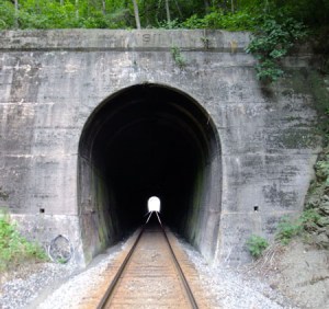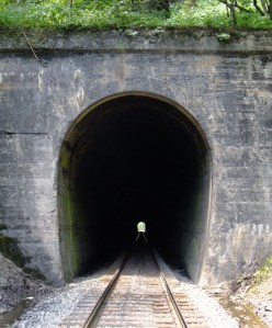 Located in Scott County VA, where the Clinch River makes a wide bend, these two tunnels bypass it by cutting through two close ridges. The North Twin (308′) is 71.26 miles south of Elkhorn City (quickly vanishing in the distance, well over the horizon, lost in Kentucky). The South Twin is just a few feet beyond the North. If you were standing between them, you’d be at 36.709679, -82.646909 and an elevation of 1343′. South Twin is just 236′, a mere slip of a tunnel. The first picture is the south portal of South Twin, looking north to the North Twin. The second picture is the north portal of North Twin, looking south to the north portal of South Twin. They’re both dated 1912.