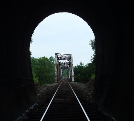 Here we are a little over 70 miles south of Elkhorn City at Starnes tunnel, 517′ portal to portal. This is the south portal, 1911 date, looking north. Again, it’s a horseshoe cross section. The next picture is from inside the tunnel looking north to what is known as the 3rd Clinch River bridge, a 372′ through rivet truss (according to James Goforth). Calvin Sneed tells that the community near here, Starnes Slant, got the name when the crews were laying the railbed around a curve and kept fighting landslides, so the “slanted” the hillside to provide stability. Hence, Starnes Slant. Hold your breath, the Twins are coming up next, then it’s on to Clinchport tunnel.