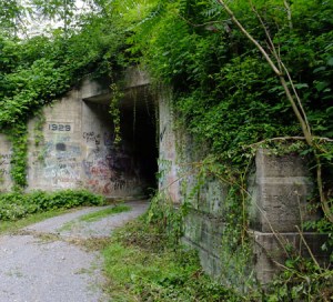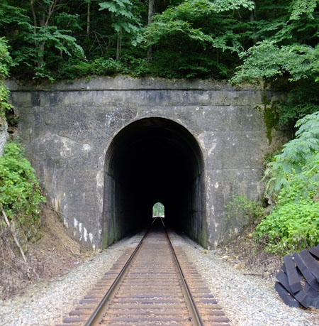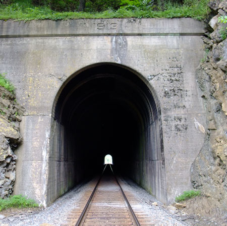 We’re a little more than 77.5 miles south of Elkhorn City at Clinchport tunnel, actually near Boulder VA. The railroad here crosses SR 644 on a 1929 overpass (shown). Tunnel is at 36.671713, -82.745216 and is 637′ long. The first picture is looking south and the second picture is looking north with the lintel of the tunnel clearly showing the 1913 date. This was two years before the Clinchfield Railroad was officially completed.