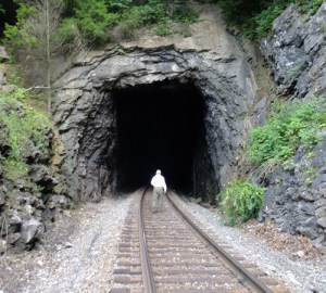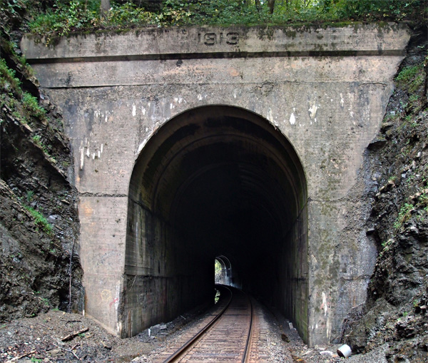 Clinch Mountain tunnel, in Scott County VA, at 36.637520, -82.735412 (center top of tunnel), is 4,135′ long. The date on the lintel is 1909. If you have hawk-keen eyes, you might just be able to see the tiny speck of white near the bottom of the tunnel opening…that’s the other end. It’s unfaced and just across Highway 23 from the Vulcan quarry in Speers Ferry, over a girder plate trestle. The next picture is back on the Kermit side of the tunnel, just off to the right. These are the ruins of a factory that was extant here in the early years of the last century. It mined sand from up on the Clinch Mountain, processed it, and shipped it Pittsburgh Glass. Odd to find that here…maybe it was super duper sand, or something. Remnants of the rail siding are still visible (not in the picture)(sidings aren’t particularly interesting).