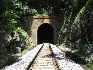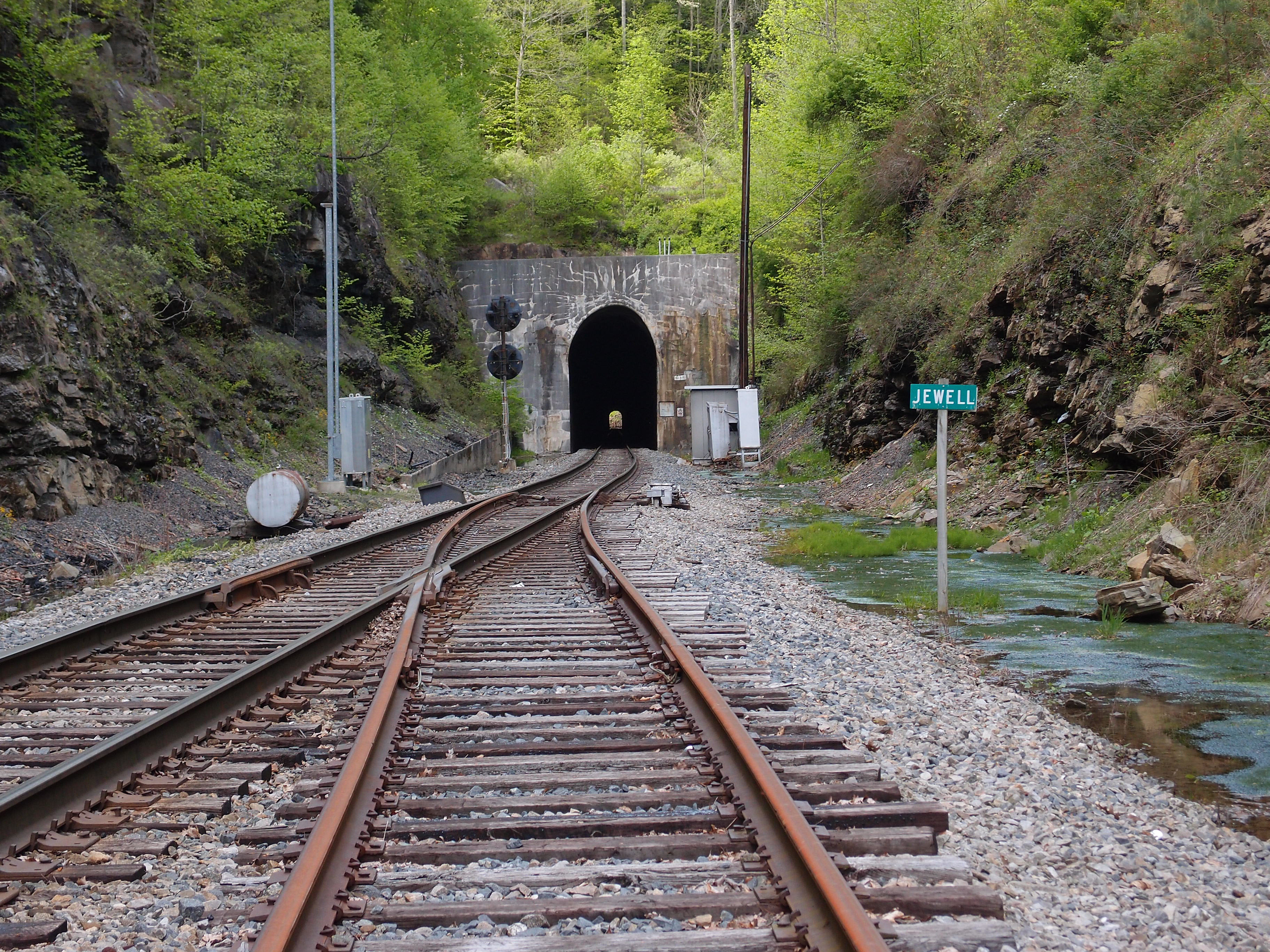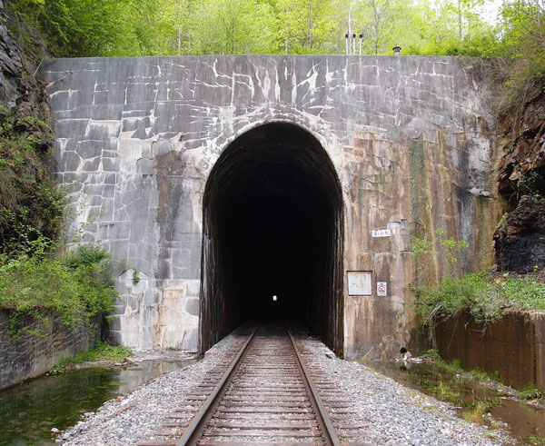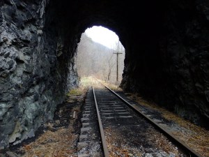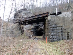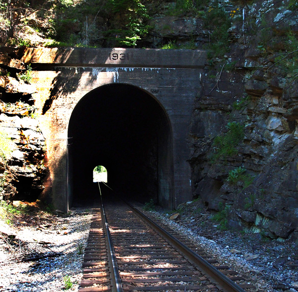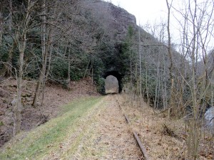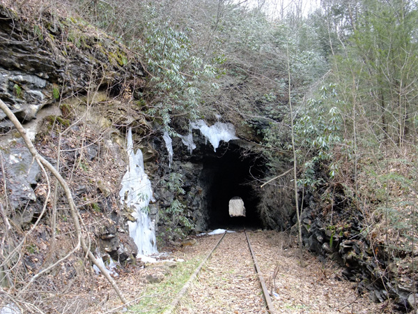 There now. On to the tunnel. This is the south face looking toward the bridge over the Russell Fork. The tunnel, 519′ long, centers at 37.256522, -82.327300.