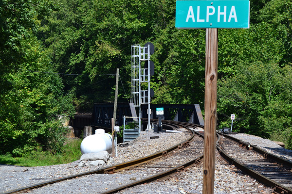 I thought I’d posted pix from this wye up in Rift WVA at 37.281159, -81.665041. There are three trestles here: a through truss, a pony truss and a pony plate. All take the line over the Clinch River. The first picture is the through truss and the second shows the humor of the rail guys. It’s hard to read the far junction sign, but it reads “‘Omega”.