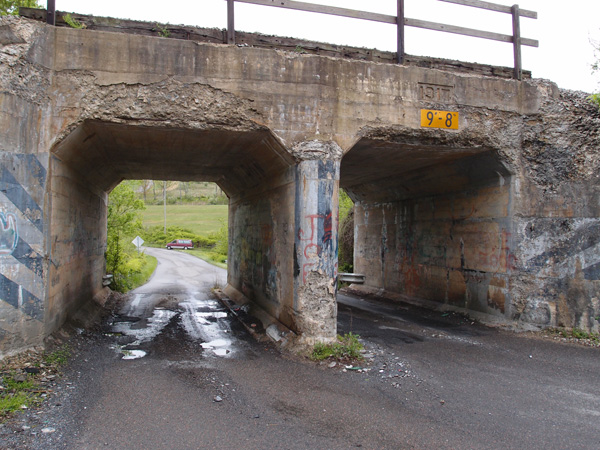 We didn’t know what to make of them, so, when I got back, I did a little research. They’re an Army job. Finished in 1992, these four tunnels divert the Clover Fork of the Cumberland River away from downtown Harlan, where there had been a history of flooding, into Martin’s Fork. The tunnels here are at 36.85526, -83.31546. The one the left carries the most water, normally. The actual input portals are at 36.85125, -83.31086, about 2,000′ away to the northeast going under Ivy Hill. The four tunnels minimize the possibility that one will get clogged up with debris in a flooding situation. Those who canoe or kayak say that these tunnels are safe, with smooth bottoms and moderate flow. The rock around the tunnels has been sprayed with concrete to stabilize it. You never know what’ll turn up in Kentucky.