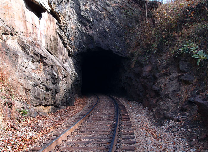 I’ll be damned if I didn’t miss a tunnel in all that scouting along the CSX line between Erwin and Altepass. My buddy called me a couple of days ago and said he’s spotted a tunnel on the topo that we hadn’t been to…it was on the Toe River, just west of Loafers Glory NC. I went up on Google Earth and located it at 36.00598, -82.23743. It’s in Goforth’s book at 163.11 miles south of Elkhorn City. I’ve looked at that list a dozen times and completely missed this tunnel. The tunnel is 304′ long on a curve and completely unfinished, except for some supporting concrete on the left of the south portal. Strong stone there, for sure. Here’s the south portal and the mile marker just before the south portal.