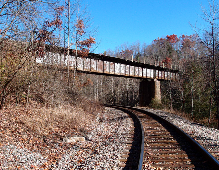 This gem of a McClintic-Marshall Company (Pittsburgh PA) 1922 deck girder is on the old Interstate line between Norton and Coeburn. It’s original, since this line was constructed in 1923 or so. It crosses an active N&S line and the Guest River. Surprisingly, the rail on the bridge is dated 2011 and it seems to have had moderate use. It centers at 36.94253, -82.58283 and it’s maybe 260′ long.