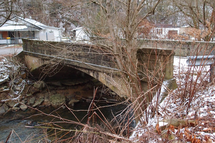 Neat, closed-to-traffic, concrete arch bridge was made by Luten Bridge of Knoxville in 1918. This goes over Puckett Creek at Stone Creek and used to connect St. Charles Road with what was then the highway between Pennington Gap and points north. It’s very near the intersection of Highway 421 and St. Charles Road just north of Pennington Gap. Here it is (this is looking from the highway side). A tip of the bald guy’s cap to Lee Stone for spotting this one.