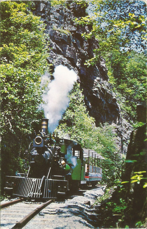 Both of these chrome postcards are from the late ’60s, when Doe River Gorge Playland was in business (check this link). As you’ll read on that webpage, for about a year, it was Hillbilly World and it closed in 1971. I’ve hiked the gorge twice, once from the Ministry side and once from the highway side. I think the one on the left shows the Engine #1 at Pardee Point, the one on the right is just a general shot of the engine steaming along.