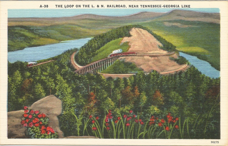 All it says on this 1940s Asheville Post Card Co. issue is “A-38 THE LOOP ON THE L. & N. RAILROAD, NEAR TENNESSEE-GEORGIA LINE”