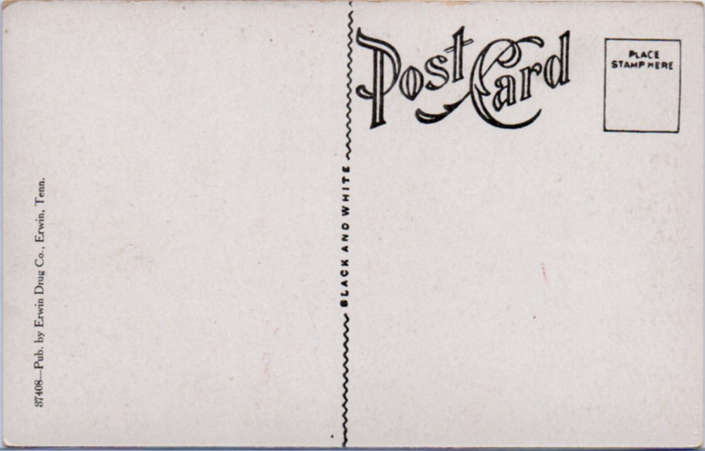 I think this card is from the early 20s. I don’t know what company actually printed it (“published by Erwin Drug” just means that the drug store commissioned the postcard run). American News Company of Boston farmed out a lot of the black-and-white work to Curt Teich in Chicago. The inventory number does seem to indicate ANC. However, I’m still working on this. I have several cards in my collection that have the same back design and one seems to indicate it was done by Asheville Post Card Company.