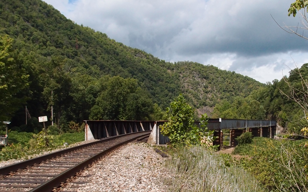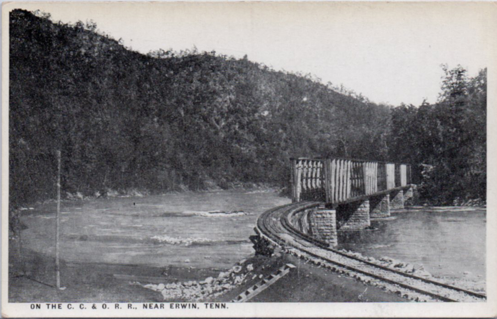 Whatever. This bridge is a 1907 replacement for an earlier timber structure and is, according to Goforth, is a TPG, a through plate girder style built on stone piers (possible: Goforth had access to original construction data and may have been using the TPG abbreviation to mean “timber plate girder”). It’s 864′ long. This view is looking back toward Erwin. Note the steps up to the railroad grade.