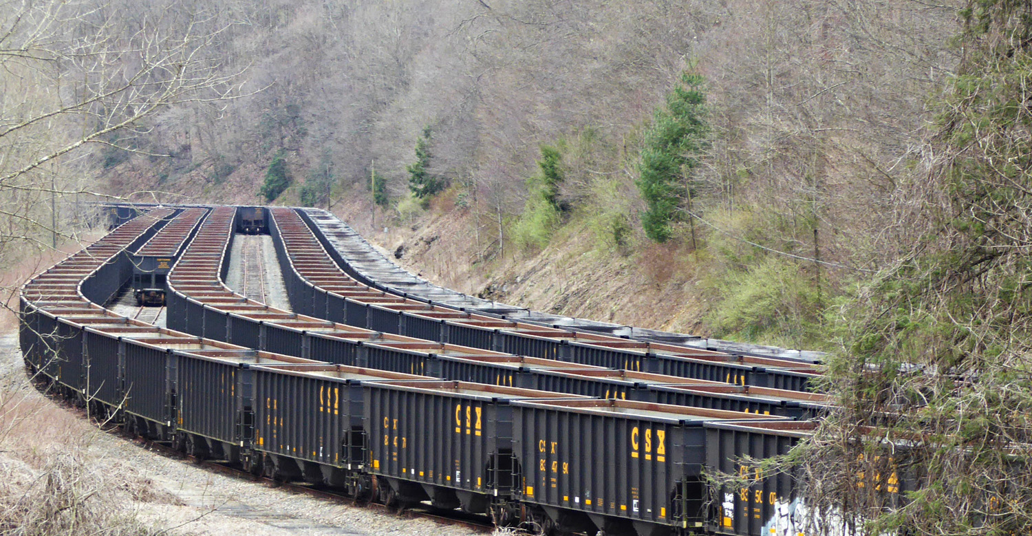 Lines and lines of empty hoppers parked in Southwest Virginia. This is looking more or less southward into Dante Yard. We were moving from Scott County into Dickenson County and back and saw a lot of these idle units. Anecdotal reports indicate that they’ve been there for a considerable time (several weeks or so). We were seeing both CSX and N&S (and some old Southern and Norfolk & Western units, too).