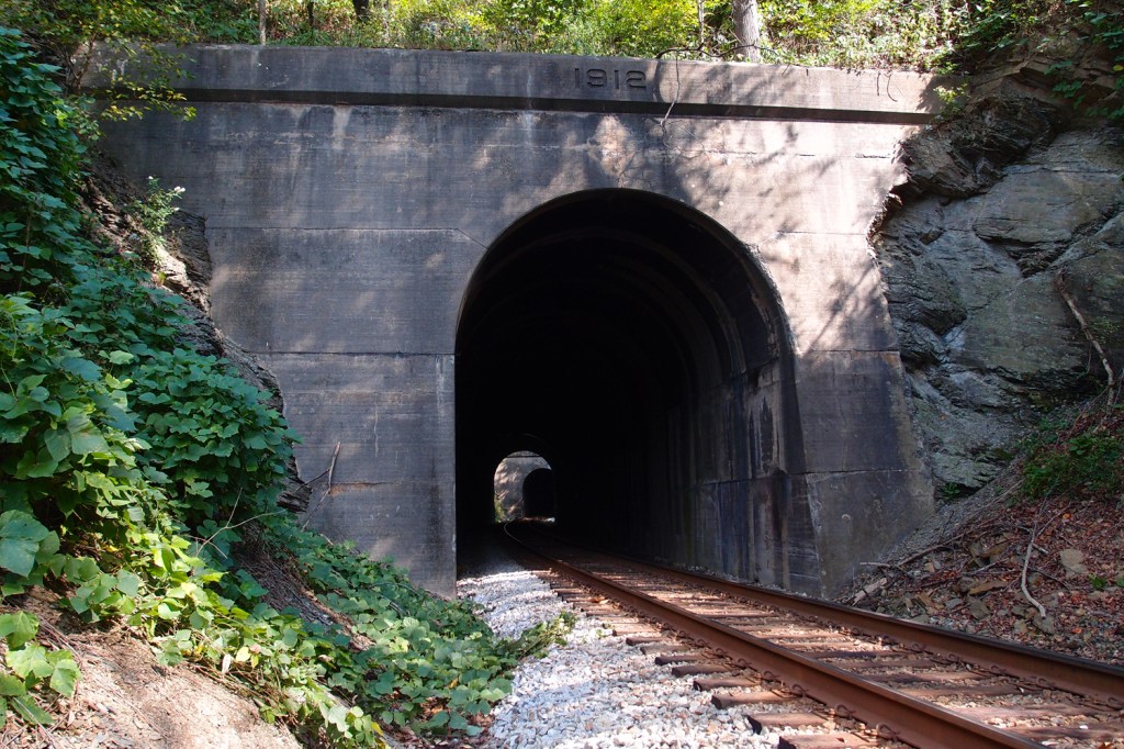 Looking north through these two short (this one is 308′, the yonder one is 236′) tunnels crossing a bend in the Clinch River (36.709679N, 82.646909W) in Scott County VA. As I’ve mentioned before, the date there is when this tunnel was faced up. The line blasted through in the early 1900s. About a mile up the track, at Starnes Bend, is Starnes Tunnel. If you backtrack for about seven miles, you’ll hit the Clinchport Tunnel in the Town of Clinchport.
