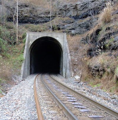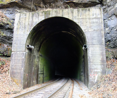 This tunnel could be called the Deane DTC This is Rockhouse Creek tunnel (see below: locals called it “Love’s Branch tunnel”). It’s rudimentarily faced off, both portals and located near Democrat KY at 37 13′ 45″ N, 82 48′ 55″ W on County road 1048, just off Love’s Creek. The tunnel is maybe 400′ long, with a curve to the east. I don’t know what purpose was served by the two horn-like things on the north portal (see comment by Jon Hirsch).