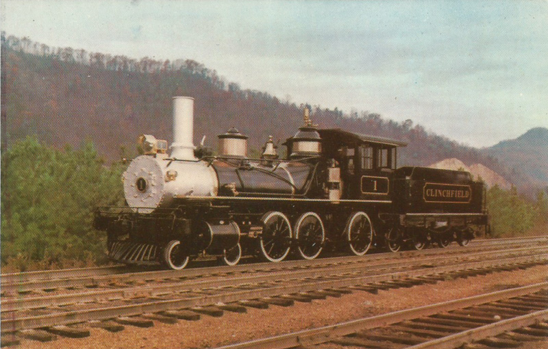 This post card, never mailed, shows the tender with the livery of 1968 with Clinchfield in gold letters.