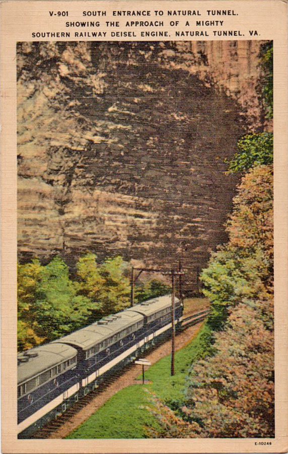 “V-901 SOUTH ENTRANCE TO NATURAL TUNNEL, SHOWING THE APPROACH OF A MIGHTY SOUTHERN RAILWAY DEISEL ENGINE, NATURAL TUNNEL, VA.” Yeah, they misspelled “diesel”.