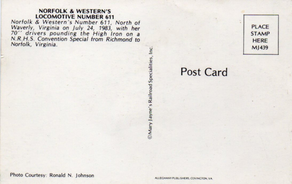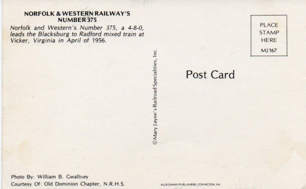 This is a Mary Jayne’s Railroad Specialties card from the early 90s. It was printed in Covington VA, where Mary Jayne Rowe lived.