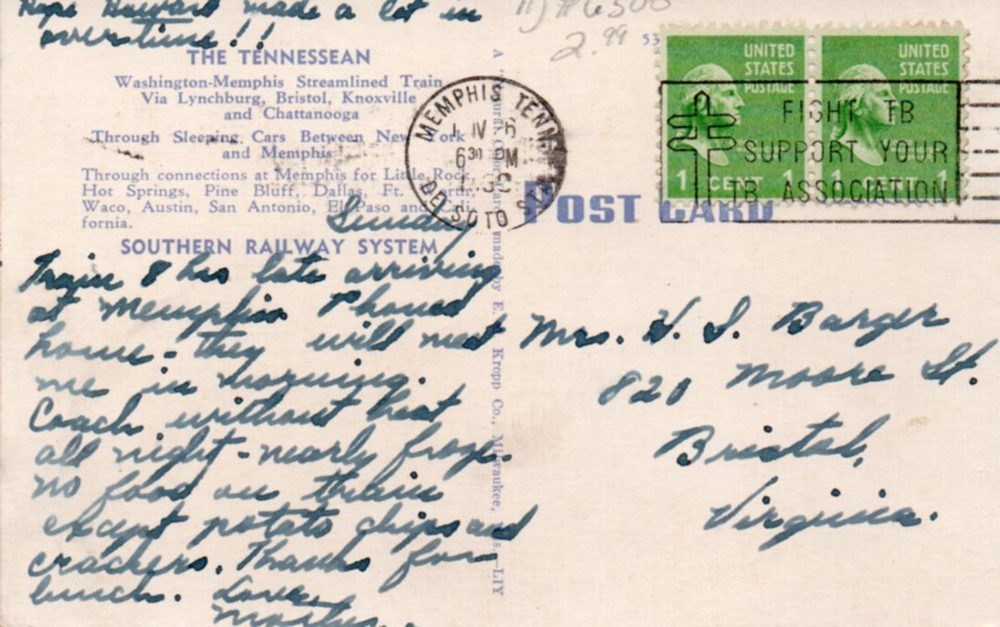 “Train 8 hrs late arriving at Memphis. Phoned (someone). They will meet me in (something). Coach without heat all night – nearly froze. No food on the train except potato chips and crackers. Thanks for lunch. Love Mother”