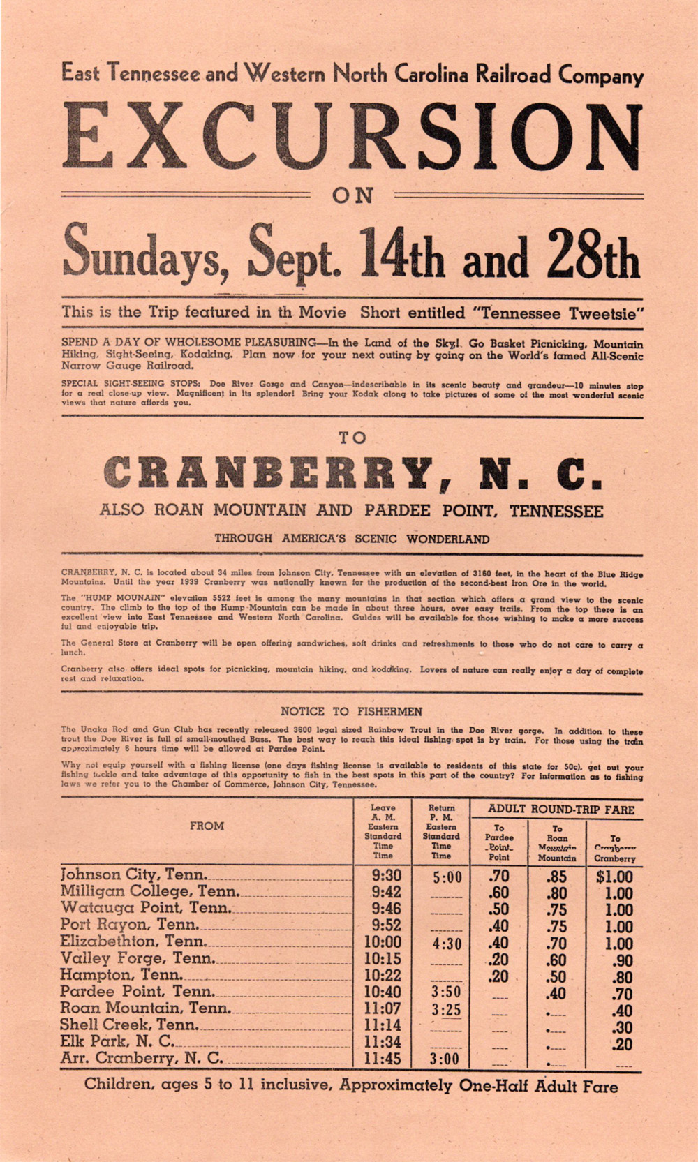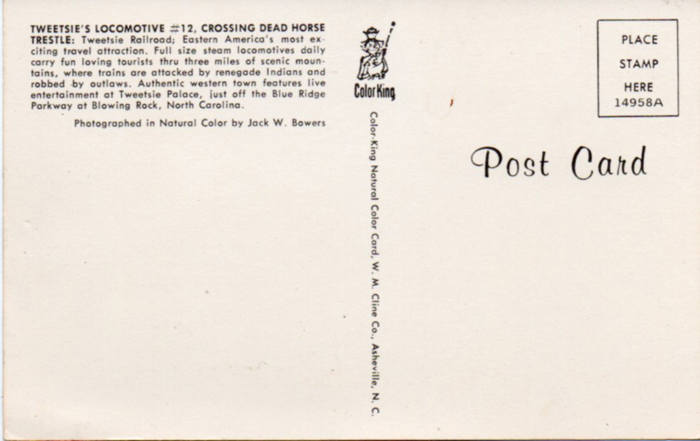 “TWEETSIE’S LOCOMOTIVE #12, CROSSING DEAD HORSE TRESTLE: Tweetsie Railroad; Eastern America’s most exciting travel destination. Full size steam locomotives daily carry fun loving tourists thru three miles of scenic mountains, where trains are attacked by renegade Indians and robbed by outlaws. Authentic western town features live entertainment at Tweetsie Palace, just off the Blue Ridge Parkway at Blowing Rock, North Carolina.”