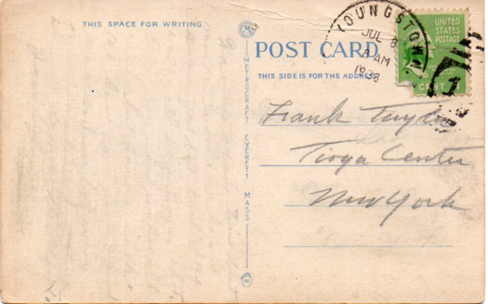 The card was mailed from Youngstown NY (north of the Falls) to Tioga Center, now just Tioga, NY, in July, 1938. Tioga is in the south of the state, between Elmira and Binghamton.