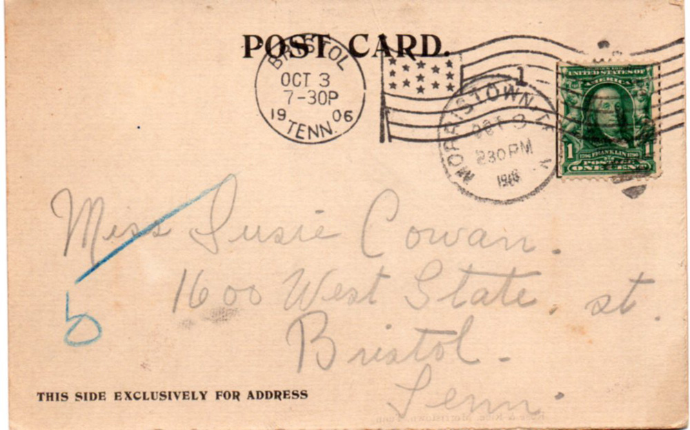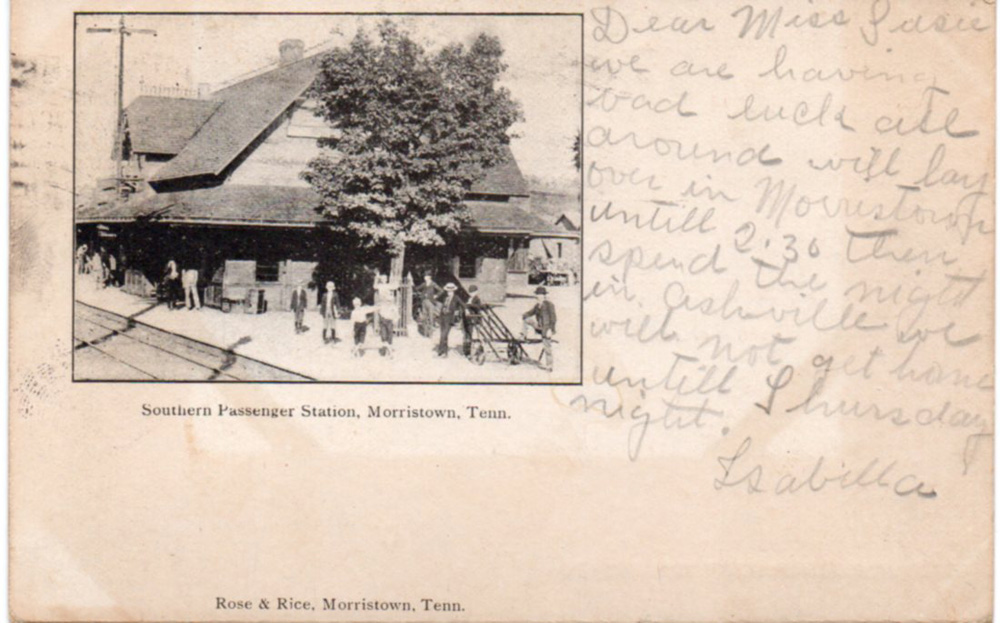 The Southern passenger station in Morristown TN pre-1906 (when his card was mailed). For the time, the printer was generous with the area on which to write a message, since, as an undivided back card, you could only write the address on the back. I still find it amazing that this card was mailed at 2:30 pm on October 3, 1906, and arrived in Bristol at 7:30 that evening.