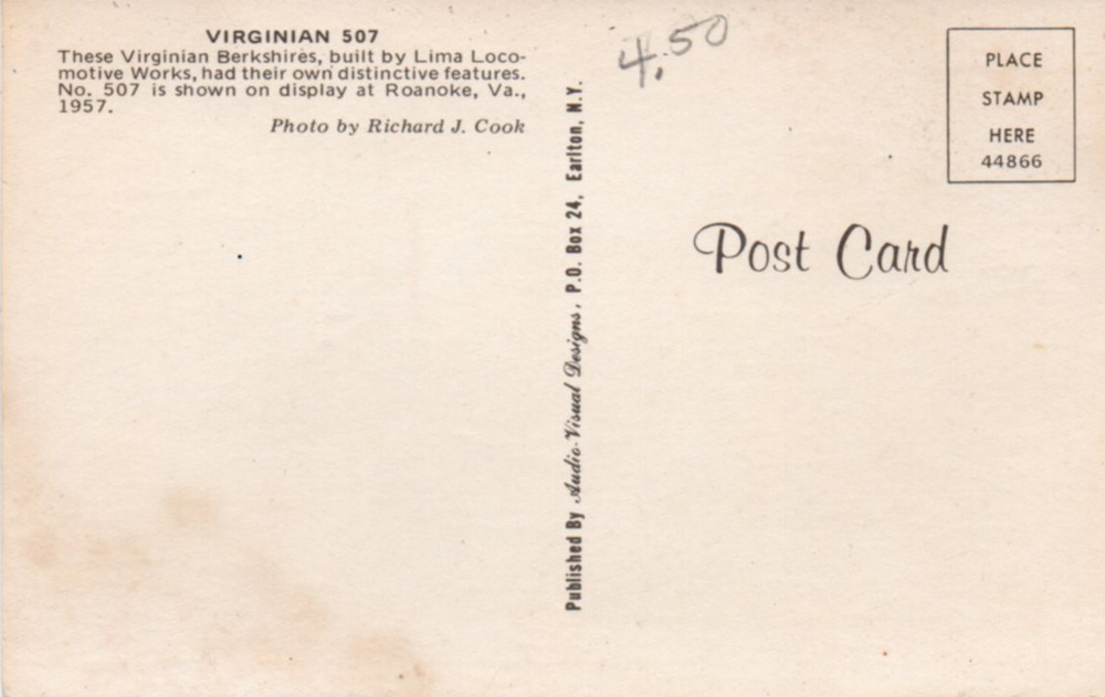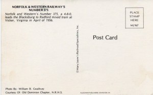 Inman is an unincorporated community in Wise County VA. This is a divided-back postcard that was allowed between 1907 and 1914. A website had this card for sale and, without attribution, stated it was “1910’s”. Close enough. I think this is an Interstate Railroad steam engine, but I can’t be sure.