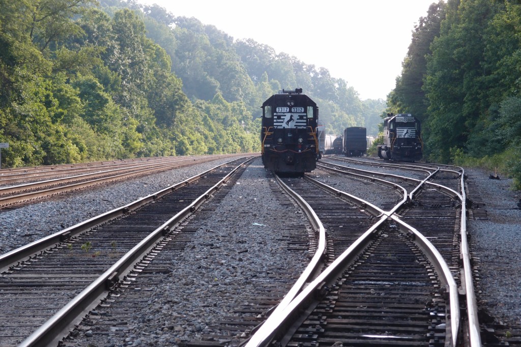 Looking north through these two short (this one is 308′, the yonder one is 236′) tunnels crossing a bend in the Clinch River (36.709679N, 82.646909W) in Scott County VA. As I’ve mentioned before, the date there is when this tunnel was faced up. The line blasted through in the early 1900s. About a mile up the track, at Starnes Bend, is Starnes Tunnel. If you backtrack for about seven miles, you’ll hit the Clinchport Tunnel in the Town of Clinchport.